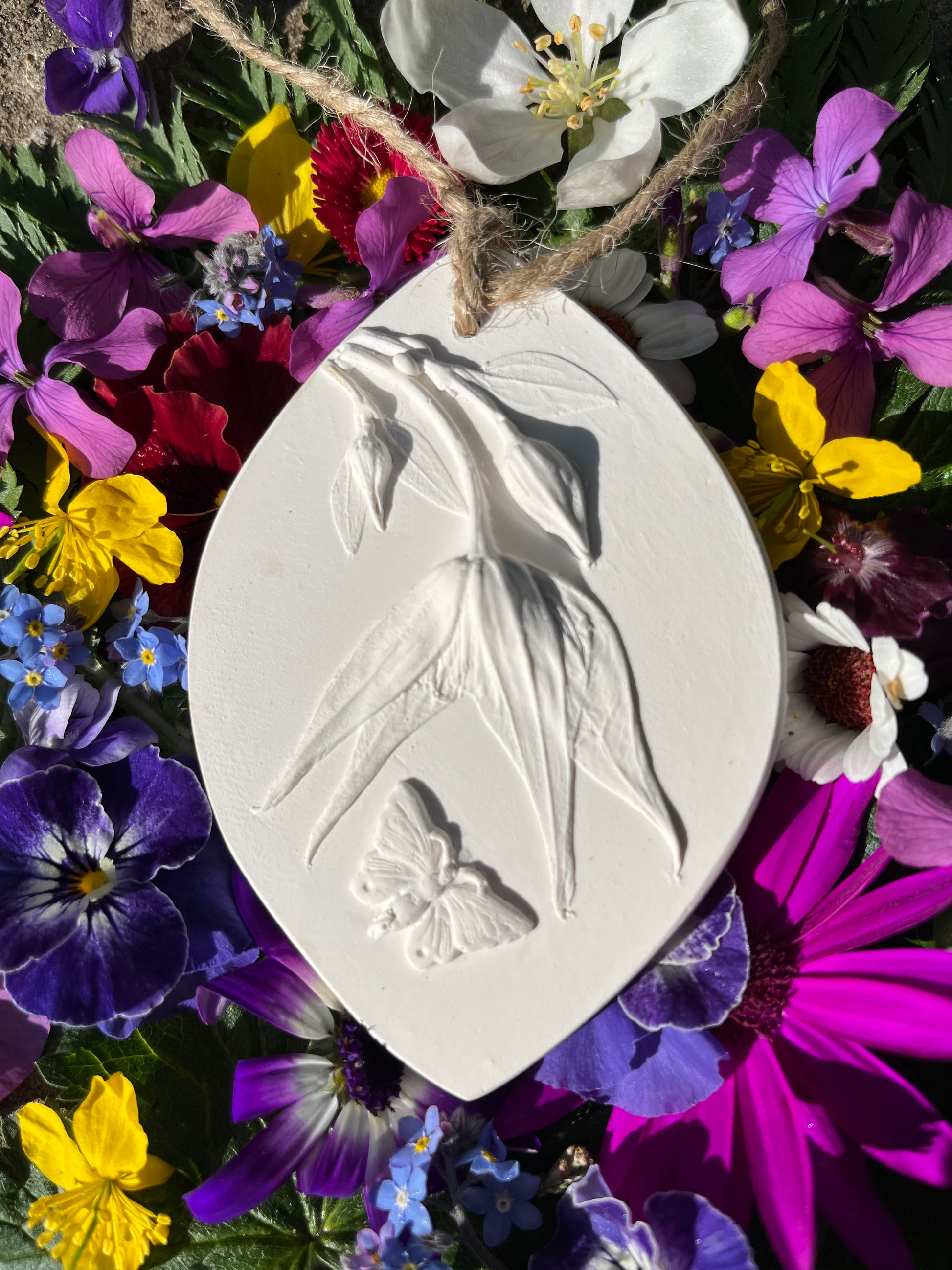 A new addition to our whimsical range. Features a botanical casting of a clematis bell flower. This is one of the early flowering clematis I have growing in my garden. Then I have added the whimsical touch of an imagined butterfly.