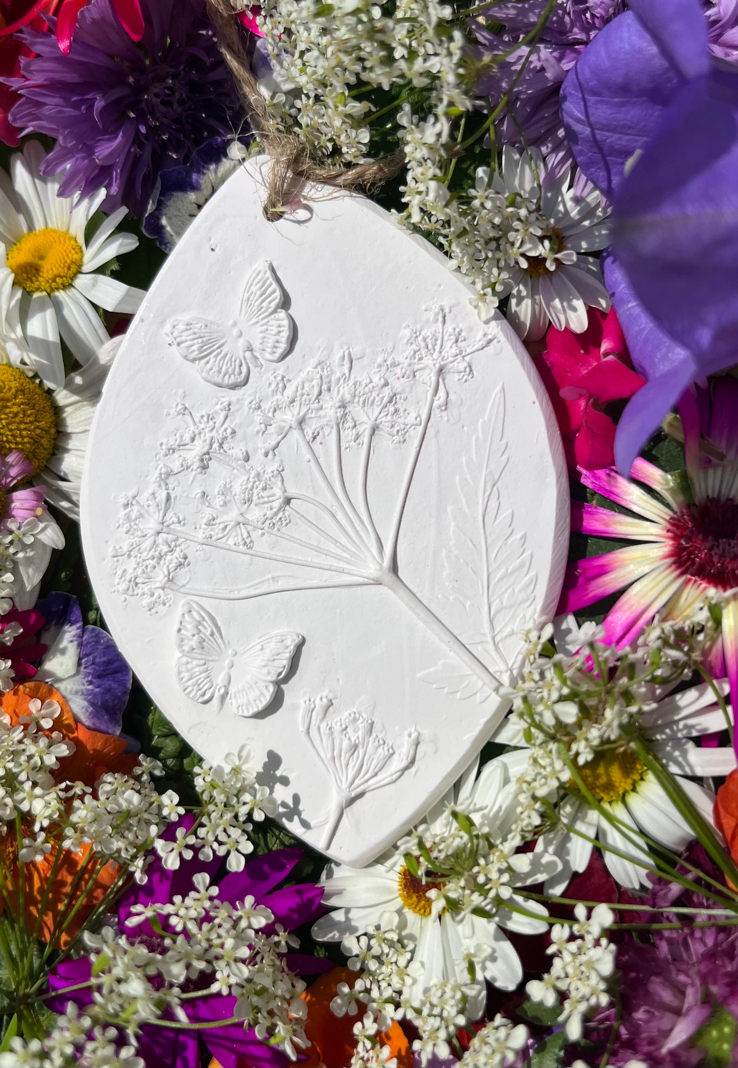 A new addition to our whimsical range. Features a botanical casting of a stem of cowparsley. Early summer our verges are a cloud of white flowers when this lovely cowparsley is in abundance. Then I have added the whimsical touch of imagined butterflies which absolutely love this flower.