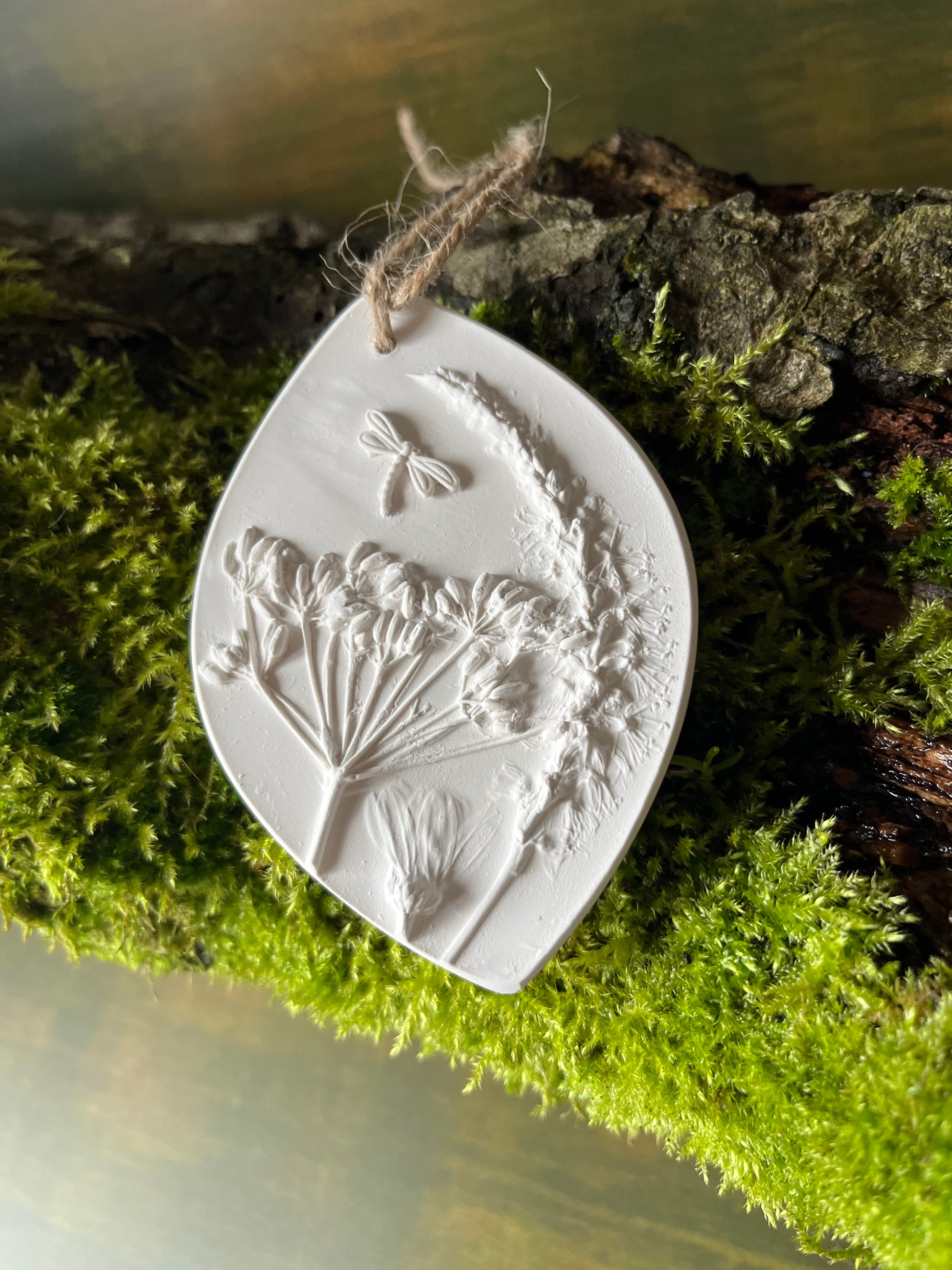 Part of our new Cottage Garden collection. This cast features a mix of botanical casts from flowers and plants found in our cottage garden. Predominately a stem of cowparsley. Then I have added the whimsical touch of an imagined dragonfly.